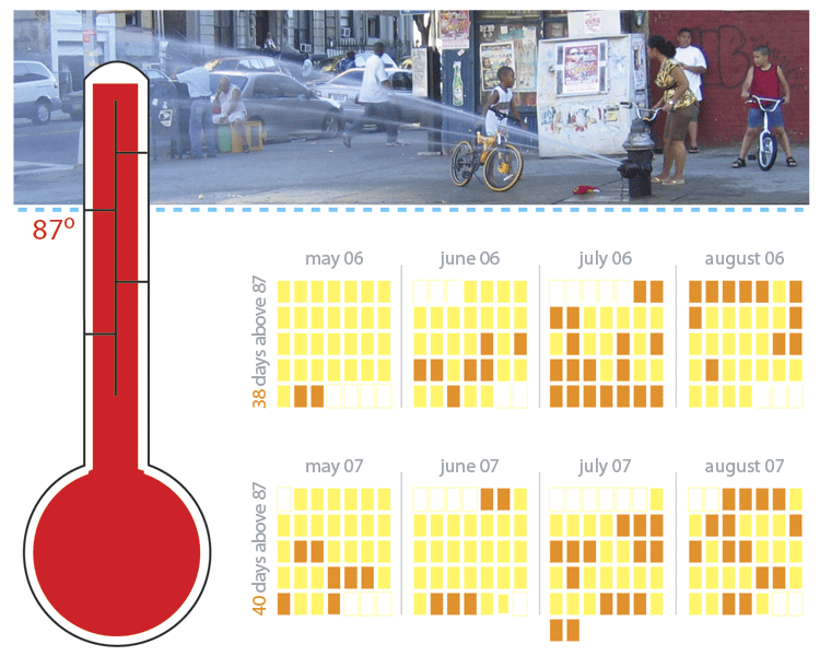 Many factors contribute to uncappings, from the physical conditions of the district to the social structure of the sidewalk. But above all is the obvious: heat. The asphalt and paving of the city intensify the heat so that New York City is often as many as 10° warmer than surrounding areas.22